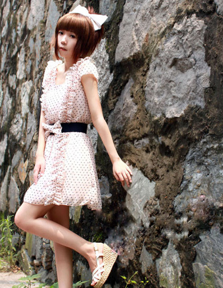 褶皱荷叶花边,增加可爱感,雪纺蝴蝶结腰带,整个衣服都很修身。真的很不错呢,显瘦,衣型非常好哦。腰围松紧带的哦。很有气质的哦。